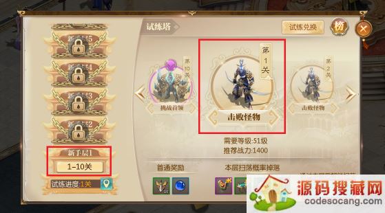 进入试练塔界面,点选关卡可以查看需要的等级和推荐战力及奖励。点击开始试练,进入挑战界面。