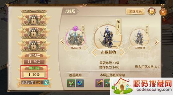 3、试练塔每层10关,需通关10关后才能挑战下一层,每5层为一个层阶。通关一层后开启扫荡功能,扫荡有次数和冷却时间限制。
