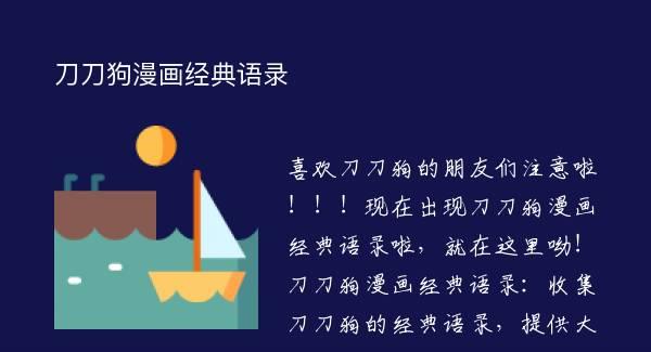 喜欢刀刀狗的朋友们注意啦!!!现在出现刀刀狗漫画经典语录啦,就在这里呦!刀刀狗漫画经典语录:收集刀刀狗的经典语录,提供大家每日更换心情签名,这里有着人生哲理、心情短句喔!...