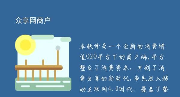 本软件是一个全新的消费增值O2O平台下的商户端,平台整合了消费资本,开创了消费分享的新时代,率先进入移动互联网4.0时代。覆盖了餐饮、电影、酒店、休闲娱乐、美业、教育培训、家装