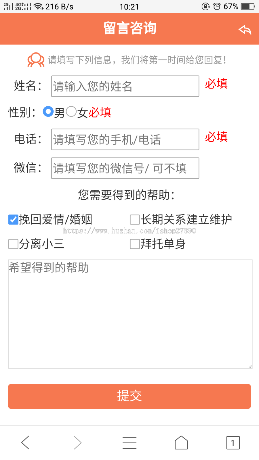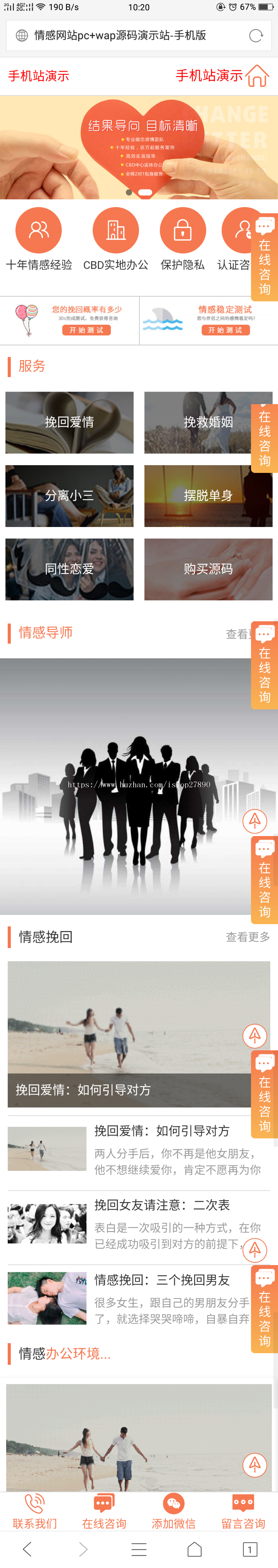 4、pc和wap端都带有 情感测试小题,用于引导客户。情感咨询类网站必备。
