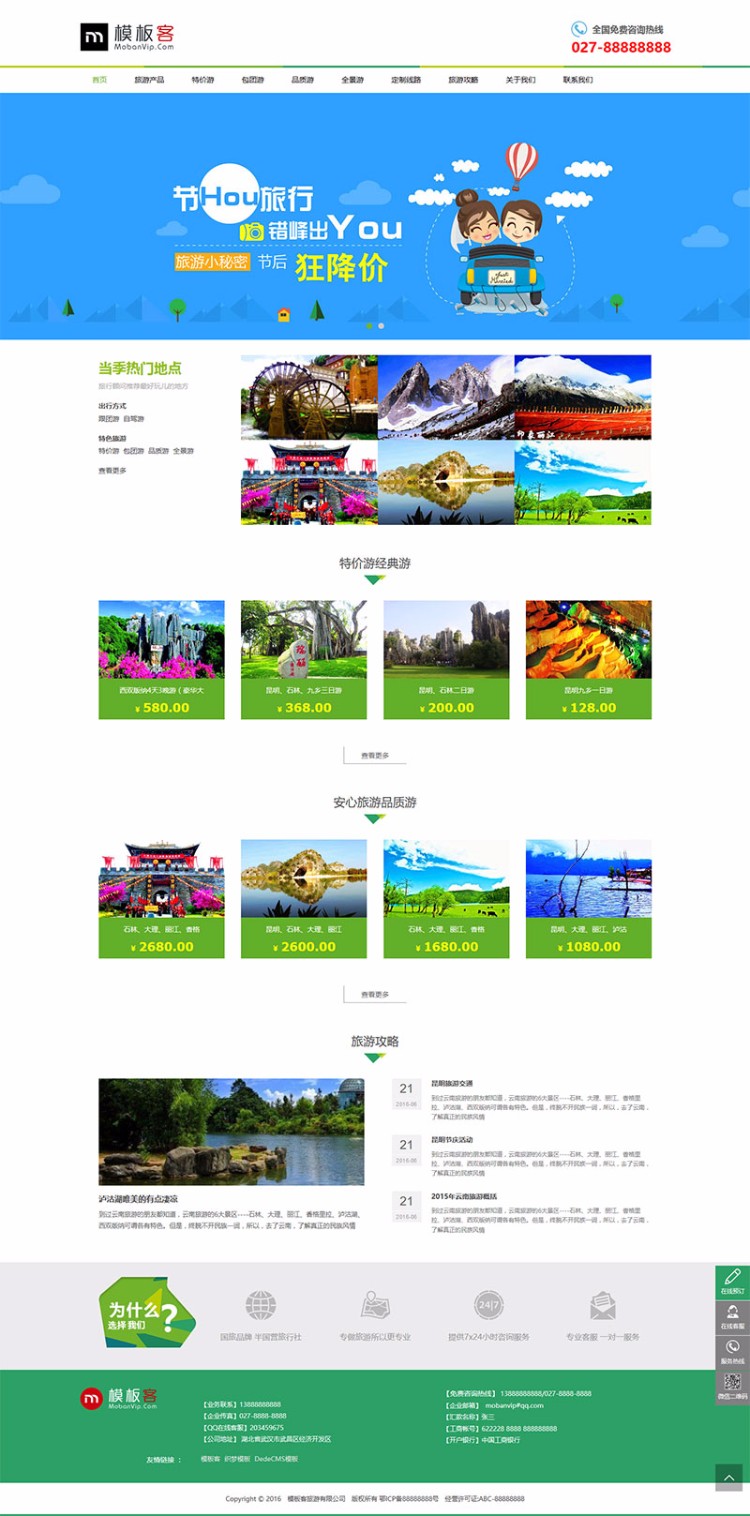 【模版介绍】:简约空气,清新自然设计风格,频道层级清楚一目了然,响应式网站设计方案,响应式电脑上、平板电脑、手机上等移动终端,很难能可贵的一款旅游类自适应网站。