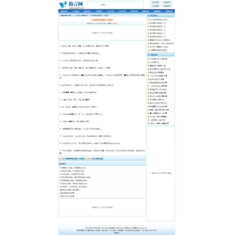 《格言网》人生格言、励志名言,模板比较清爽简单。可以随便修改成其他类型的站点,这方面需求的人应该也是挺多的,毕竟积极向上,程序带火车头采集,带手机版。
