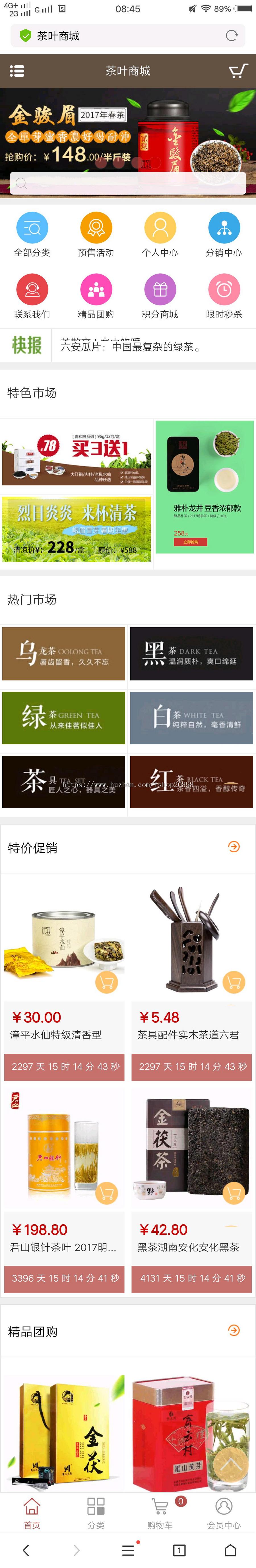 该源码是一套大气好看的茶叶商城完整源码,功能强大,界面好看大方美观,多的不多说,下面我给大家提供前台后台演示地址和相关登录密码,想做网上茶叶商城的朋友可以具体详细看下前后台演示效果功能!