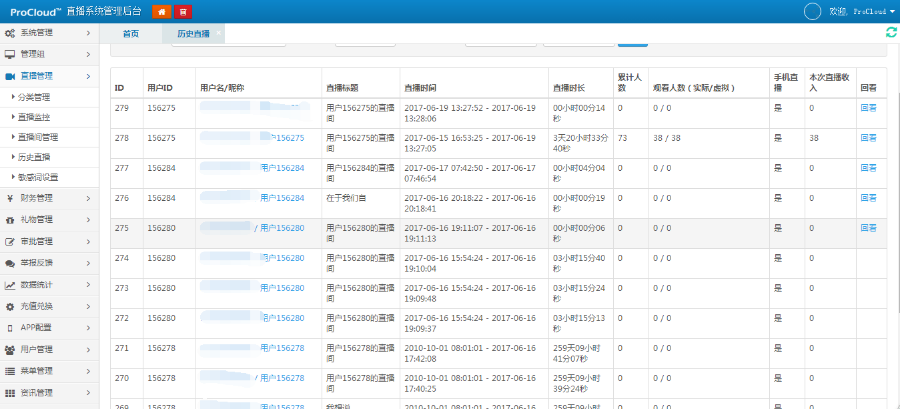 充值记录:显示选择的时间内的所有充值用户的充值详情列表