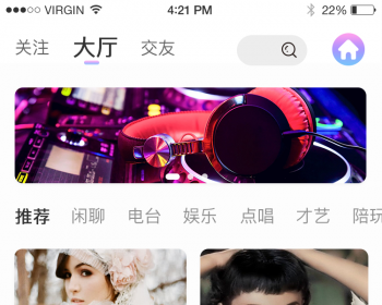 服务厅控制模块下包括:强烈推荐、闲谈、广播电台、游戏娱乐、发电厂、才艺表演、游戏陪玩等。