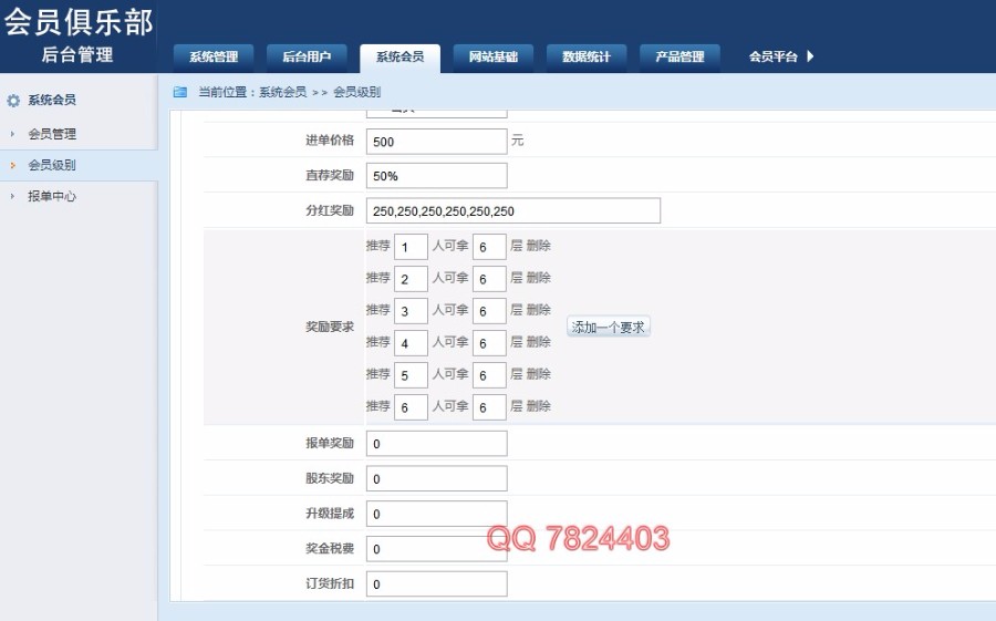 会员权益自定设定,签单设定,直推奖,分紅奖,公司股东奖,签单奖,带商城系统订单管理系统