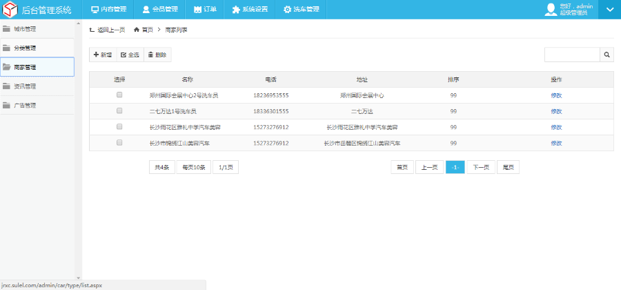 11、洗车店管理方法: 城管执法 、分组管理、 店家管理方法、新闻资讯管理方法、广告管理(api对接小程序