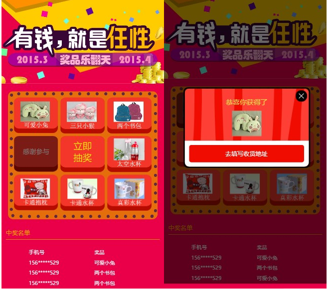 并规定键入收件地址的按键,填好收件地址页面包含,收网址宣传单页模板件人,手机号码,省市县三级联动下拉列表等字段名,便捷做主题活动搜集会员资料,和礼品的派发;7种礼品,每个礼品的几率后台管理能够设定;后台管理能够调节每个礼品的中奖概率和礼品总数,能够调节每人的报名参加频次。