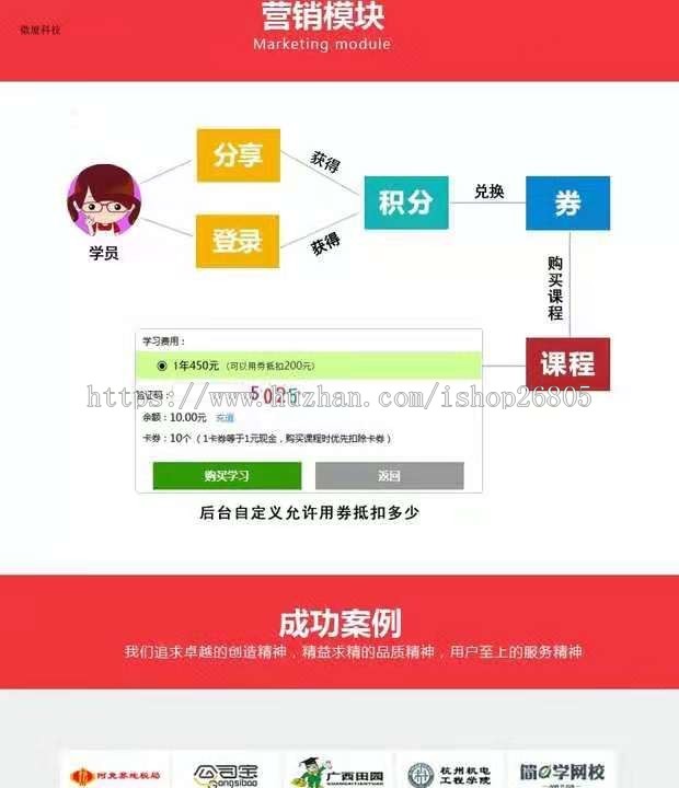 (7)团购价课程内容:管理人员能够 在后台管理设定学习卡,每一张学习卡能够 管理方法好几个课程内容,对于一次选购好几个课程内容的学生能够 立即市场销售学习卡,学生登陆后应用学习卡在线充值,能够 商城系统后台管理智能管理系统模版全自动大批量启用关系课程内容。