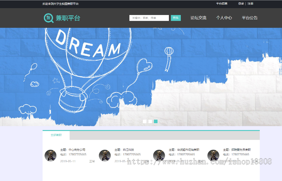 主页浏览详细地址:http://localhost:8080/moonlighting/pc/index/goIndex.action,