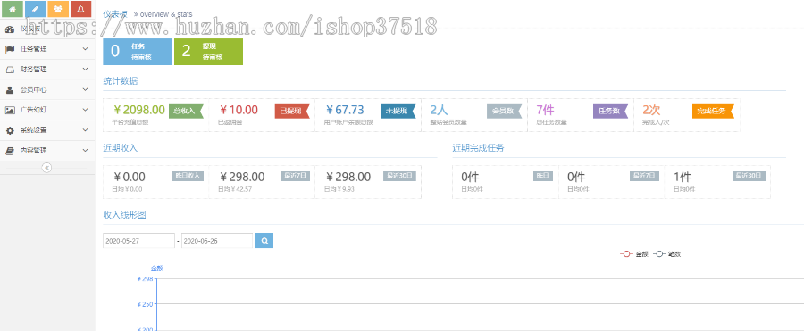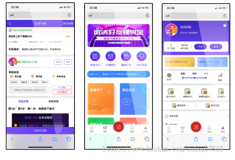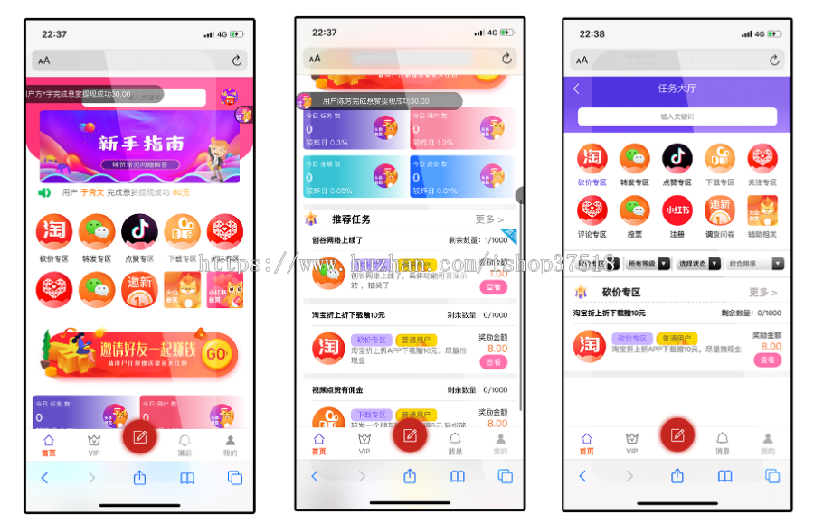首页任务接单,主要分为抖音和快手任务关注点赞,用户可以领取符合要求的任务,完成相应任务打开app关注和点赞,截图提交,后台审核通过后即可领取佣金,根据不同的等级每天领取的任务数量和奖励都不一样,后台设置,可以通过海报等推广方式,获取相应返佣,同时还可以领取推广下线的任务返利。