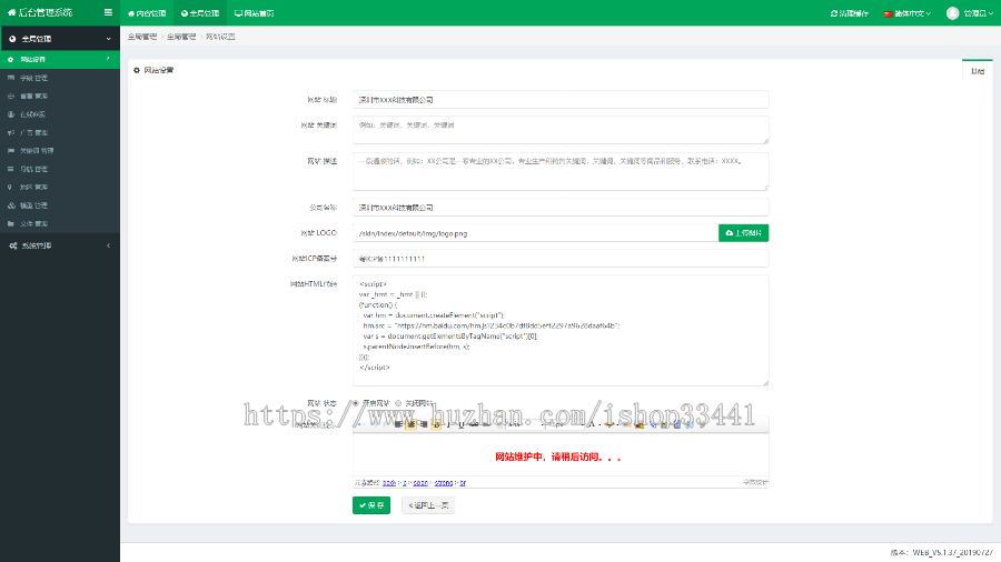 管理图片和配件、网址设定、字段名、在线客服、广告宣传、导航栏、留言板留言、基本参数、数据备份、权限管理