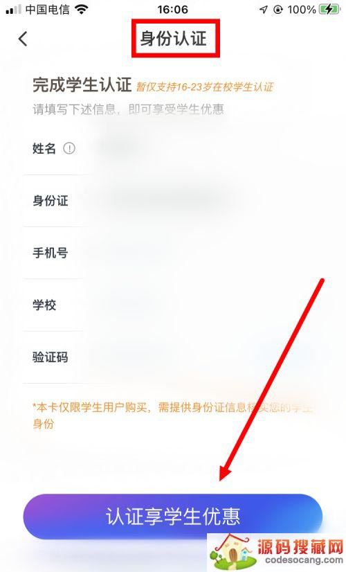 然后,输入【姓名】、【身份证号】、【手机号】、【学校】等信息,最后点击【认证享学生优惠】即可。