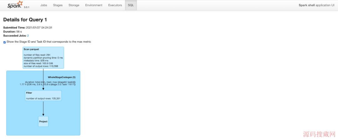 查询计划与上面类似,但由于改进了数据局部性和谓词下推,Spark可以修剪很多行。进行Clustering后,相同的查询在扫描parquet文件时仅输出11万行(2000万行中的),这将查询时间从2.2分钟减少到不到一分钟。