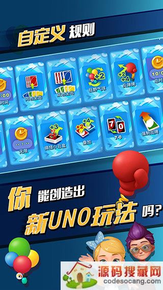 还记得那些货架上令人心动的专属卡吗?他们化身各种规则卡,让你随意组合并命名属于自己的规则体系,在免费的房间模式中使用。试想一下,把小丑牌、反弹牌、连续+2+4、换牌、强制出牌等全部合在一起,是怎样的神奇乐趣。再也不怕你家的村规在游戏里找不到了!
