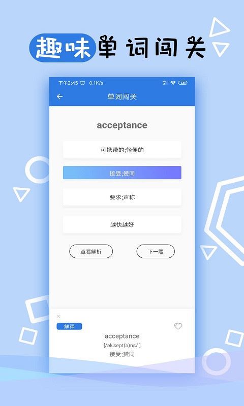 2、生词本,将忘记了或者不熟悉的词汇加入生词本,没事看一眼,让陌生词汇从你身上消失。