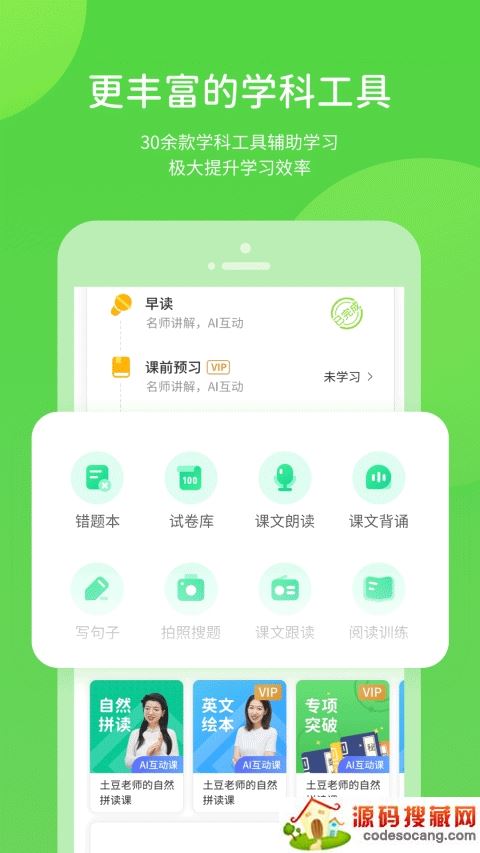 字词闯关、作文宝典、课内同步学、老师作业、课文跟读、名家朗读