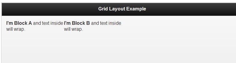 <!doctype html> <html lang="en"> <head> <meta charset="utf-8"> <meta name="viewport" content="width=device-width, initial-scale=1"> <title>grid-layout demo</title> <link rel="stylesheet" href="http://code.jquery.com/mobile/1.3.0/jquery.mobile-1.3.0.min.css"> <script src="http://code.jquery.com/jquery-1.9.1.min.js"></script> <!-- The script below can be omitted --> <script src="/resources/turnOffPushState.js"></script> <script src="http://code.jquery.com/mobile/1.3.0/jquery.mobile-1.3.0.min.js"></script> </head> <body> <div data-role="page"> <div data-role="header"> <h1>Grid Layout Example</h1> </div> <div data-role="content"> <div class="ui-grid-a"> <div class="ui-block-a"><strong>I'm Block A</strong> and text inside will wrap.</div> <div class="ui-block-b"><strong>I'm Block B</strong> and text inside will wrap.</div> </div><!-- /grid-a --> </div> </div> </body> </html>