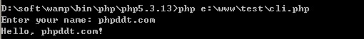 // ask for inputfwrite(STDOUT, "Enter your name:");// get input$name = trim(fgets(STDIN));// write input backfwrite(STDOUT, "Hello, $name!");运行截图: