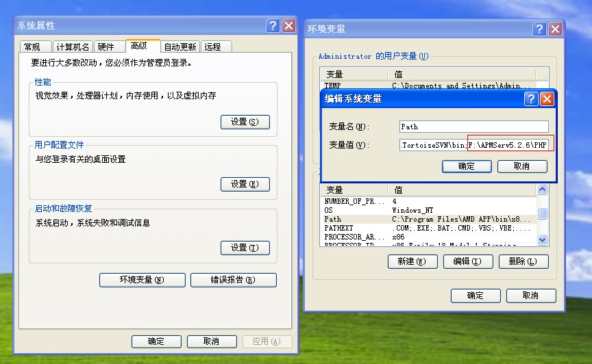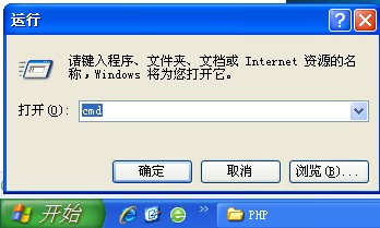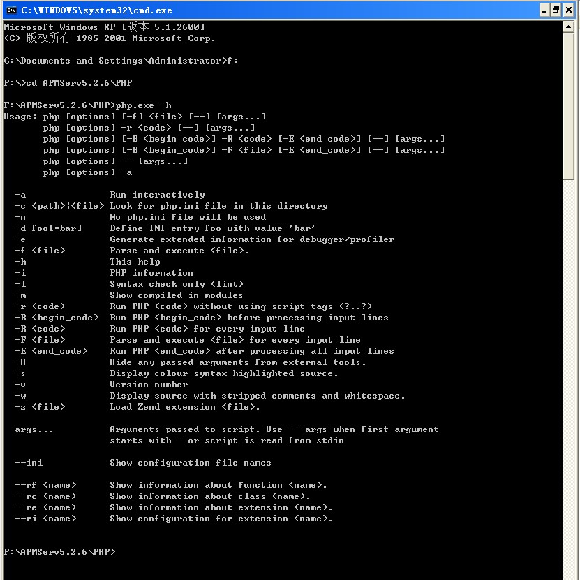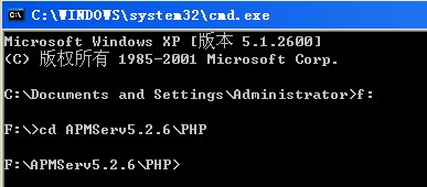 在我的个人电脑上,操作系统是 windows xp,在F:APMServ5.2.6PHP目录下 php.exe