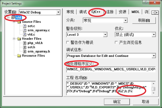 图36、修改工程设置,选择【工程】(Project)->【设置】(Settings)->【C/C++】,在【工程选项】(Project Options:)的 最后加上 /Tc,在预处理程序定义中添加如下宏定义:ZEND_DEBUG=0,COMPILE_DL_VLD,ZTS=1,ZEND_WIN32,PHP_WIN32,HAVE_VLD=1