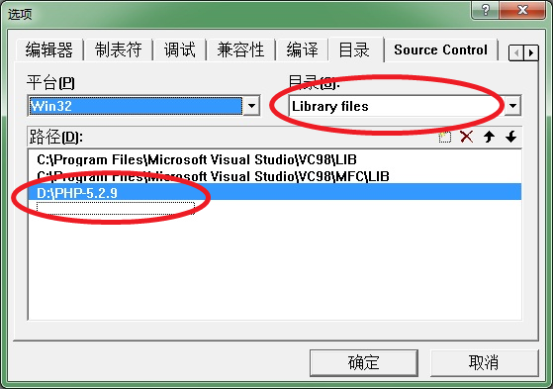 8、选择【工具】(Tools)->【选项】(Options)->【目录】(Directories),在 【目录】(Show directories for:) 下拉框中选择 “Library files”,在 【路径】(Directories) 中添加 D:php-5.2.9 (即 php5ts.lib 所在目录);如图5所示: