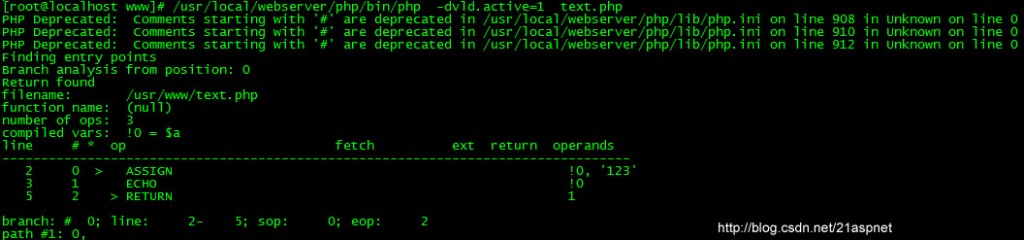 Branch analysis from position: 0 Return found filename: D:workxamppxamppphpt.php function name: (null) number of ops: 5 compiled vars: !0 = $a line # * op fetch ext return operands --------------------------------------------------------------------------------- 2 0 > EXT_STMT 1 ASSIGN !0, 10 3 2 EXT_STMT 3 ECHO !0 4 4 > RETURN 1 branch: # 0; line: 2- 4; sop: 0; eop: 4 path #1: 0, 10如上为VLD输出的PHP代码生成的中间代码的信息,说明如下: