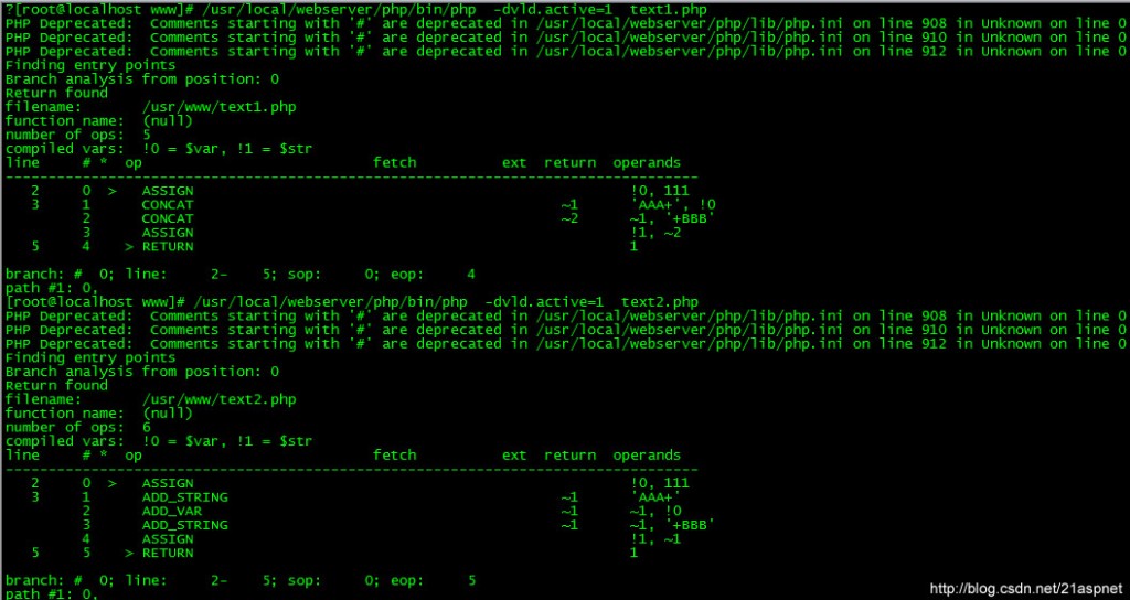 Finding entry points Branch analysis from position: 0 Add 0 Add 1 Add 2 Add 3 Add 4 Return found filename: D:workxamppxamppphpt.php function name: (null) number of ops: 5 compiled vars: !0 = $a line # * op fetch ext return operands -------------------------------------------------------------------------------- - 2 0 > EXT_STMT RES[ IS_UNUSED ] OP1[ IS_UNUSED ] OP2[ IS_UNUSED ] 1 ASSIGN OP1[IS_CV !0 ] OP2[ , IS_CONST (0) 10 ] 3 2 EXT_STMT RES[ IS_UNUSED ] OP1[ IS_UNUSED ] OP2[ IS_UNUSED ] 3 ECHO OP1[IS_CV !0 ] 4 > RETURN OP1[IS_CONST (0) 1 ] branch: # 0; line: 2- 3; sop: 0; eop: 4 path #1: 0, 10以上的信息与没有加-dvld.verbosity=3的输出相比,多了Add 字段,还有中间代码的操作数的类型,如IS_CV,IS_CONST等。 PHP代码中的$a = 10; 其中10的类型为IS_CONST, $a作为一个编译期间的一个缓存变量存在,其类型为IS_CV。