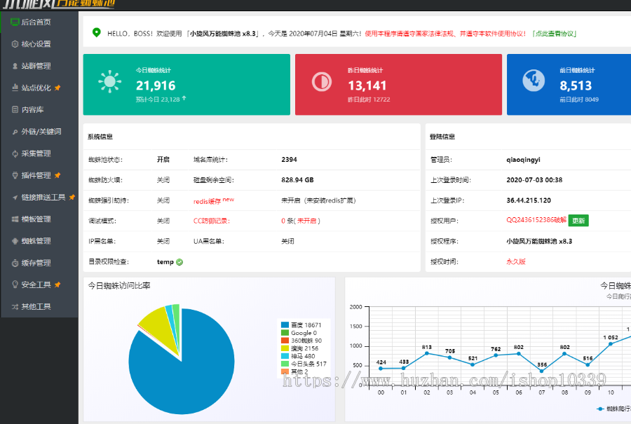 小旋风蜘蛛池站群系统 X8.3版本号 无受权限定 极致破解版下载 作用一切正常 演试站咨询客服!