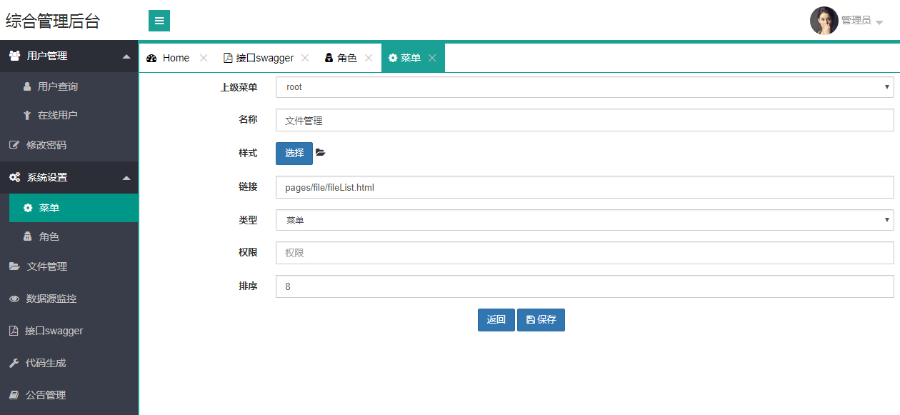 莱单管理方法:莱单目录、加上莱单、改动莱单、删掉莱单、管理权限配备、莱单标志设定、莱单排列