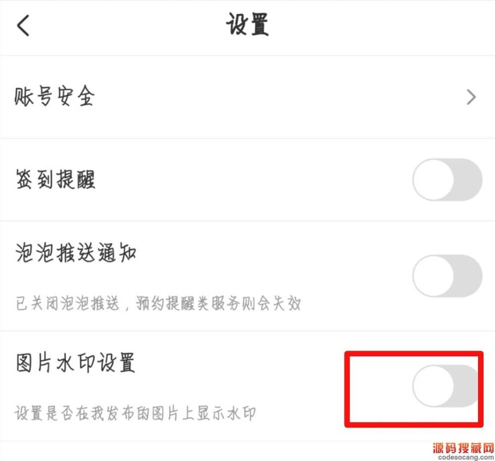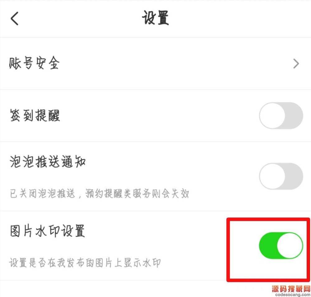 5、在设置页面点击开启【图片水印设置】,开启之后按钮是绿色的。