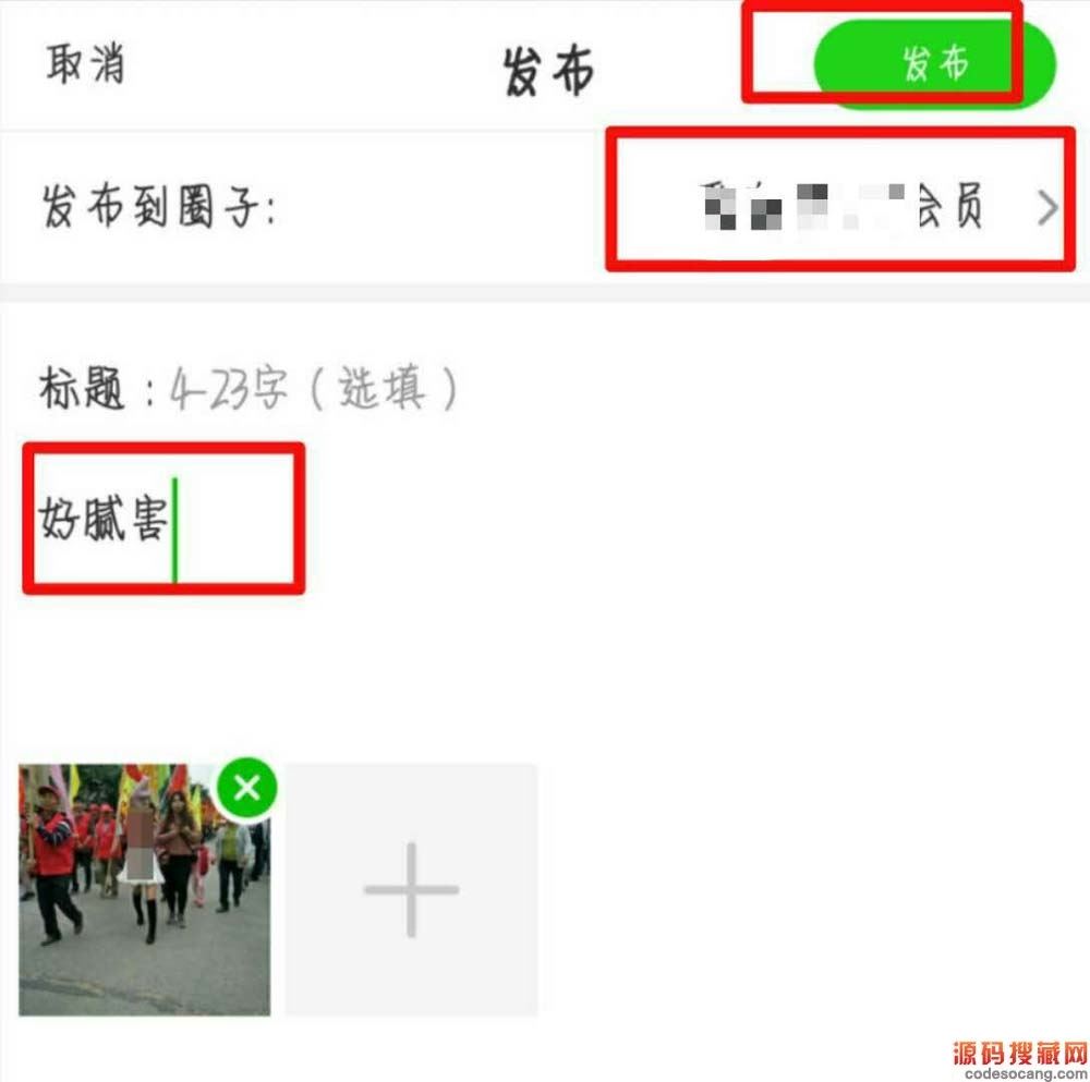 7、新窗口点击【图片】,在发布页面选择要发布的圈子、编辑文字、添加图片,然后点击右上角的【发布】,发布成功之后,就可以看到图片上面的水印了哦。