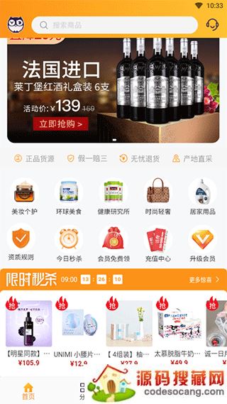 1、首页界面会推荐一些活动中的商品和正在限时秒杀的商品,还能查看资质规则,会员免费领,充值中心,升级会员等功能