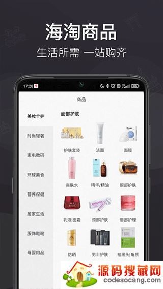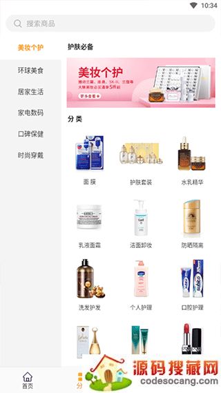 2、分类界面可以直接搜索需要的商品,也可以根据美妆个护,环球美食,居家生活,家电数码,口碑保健,时尚穿戴来分类查找