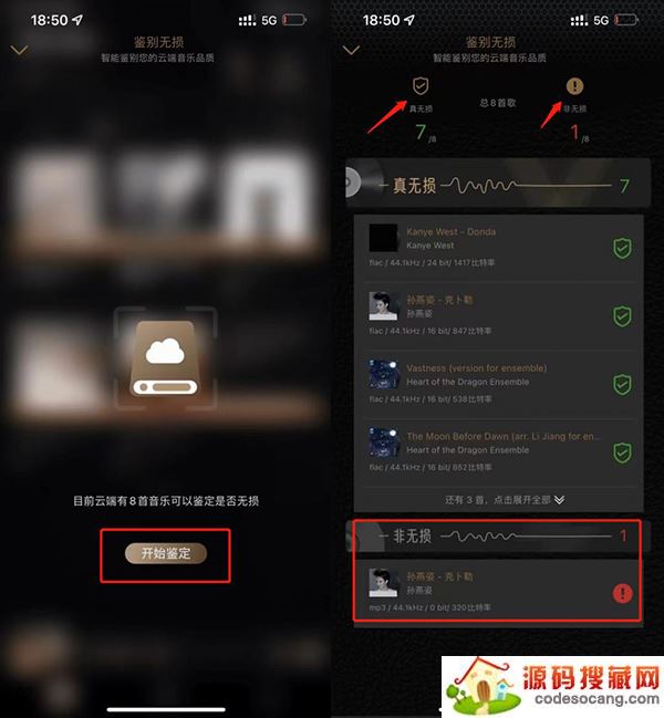那么问题来了,我们从本地下载的音乐如何鉴别是否为 HiFi 音乐呢?对此,云赏 HiFi 提供了 " 鉴别无损 " 的功能。在扫描云端上传的音乐后,会自动给出 " 真无损 " 和 " 假无损 " 两种答案,并在每首歌的下方显示音乐音频压缩编码、频率、比特、比特率的专业音乐参数。
