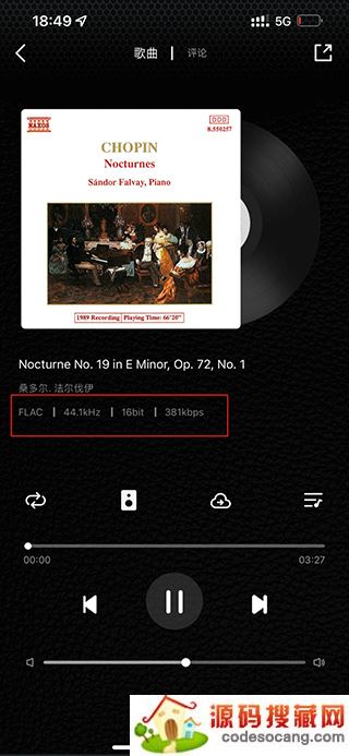 云赏 HiFi 中有一个关键词 HiFi,译为高保真音乐。但行业认为 HiFi 过于玄学,于是出现了能够量化音质标准的 Hi-Res,行业普遍将高于 44.1kHz 采样率 /16bit 深度称之为 Hi-Res。于是我们就能在云赏 HiFi 的播放页中,看到对应的参数值。在云赏 HiFi 提供的曲库中,全部都符合为 HiFi 音乐标准。