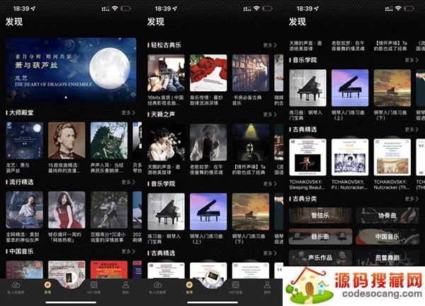 与其他音乐 App 不同的是,云赏 HiFi 的主界面更简洁,而且无广告。同时偏暗的色调也带有自己专属的风格。在分类方面,有大师殿堂、流行精选、中国音乐、天籁之声等,用户可根据自己的喜好进行选择。