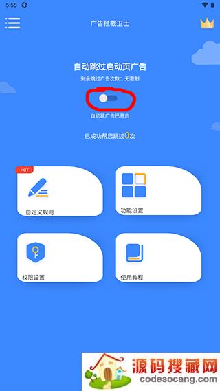 5、回到软件首页,自动跳过广告开关为绿色说明服务已经开启。