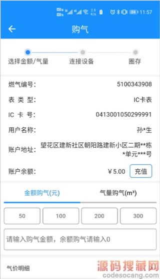 4、按照界面提示核对用户信息,并输入购气金额或购气量,输入完成后进行支付