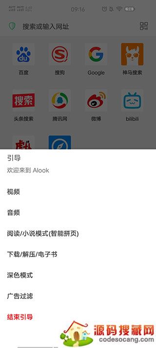 1、下载并打开ALOOK浏览器,会出现引导菜单该浏览器是没有广告的,要是没有会员看视频比在APP看还要给力。