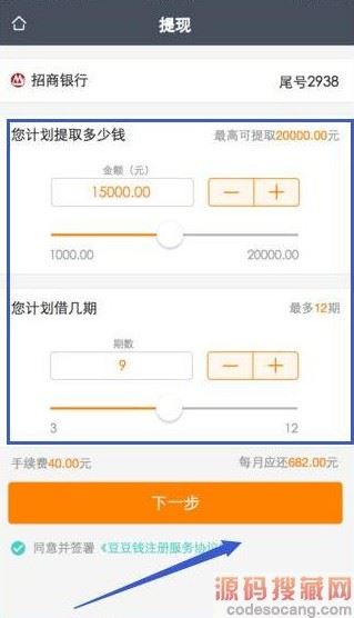 5、选择你提现的银行卡及提现的金额的期数然后点击下一步即可等待放款;