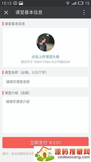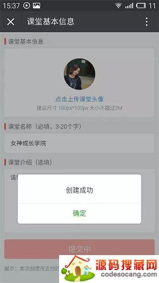 3、选择上传课堂头像(课堂头像默认为注册微信的微信头像)、填写课堂名称(课堂名称长度要求为3-20个字)、填写课堂简介;