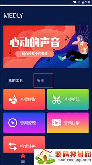 1、首先下载安装软件,在手机上打开,进入软件页面点击乐器栏目;