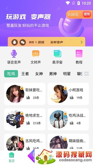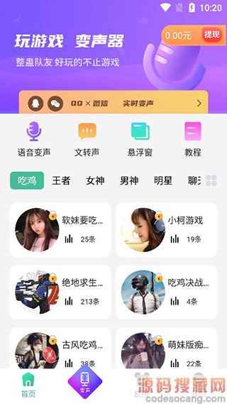 1、在本站下载提供的tt变声器,进入之后可以在主界面当中找到自己喜欢的语音包类型。