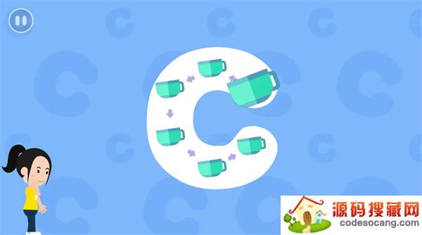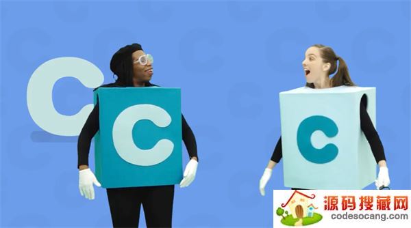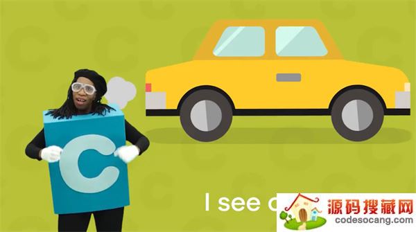 如上图所示,大小写字母分别有两个人扮演,他们之间会有对话,两个人用夸张的方式引导小朋友关注大写C和小写c的不同,而且会教小朋友跟读C字母的发音,接着用单词举例。