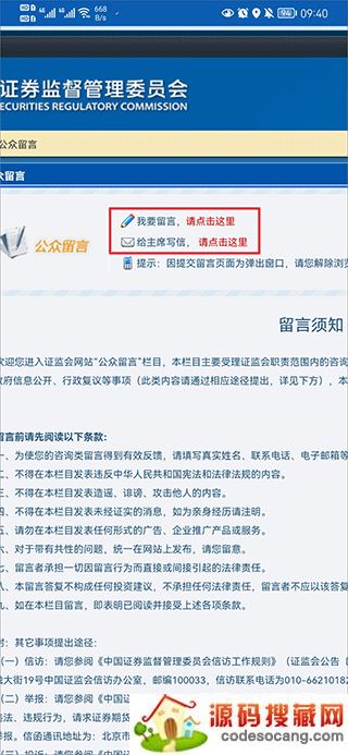 3、若用户资讯类问题、以及证监会工作的意见和建议可以在服务界面中点击公众留言进行留言
