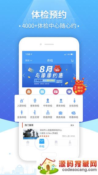 4000+体检中心、医院合作资源,为用户提供各类体检套餐在线选择、购买的服务