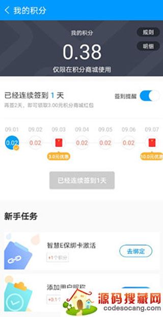 1、打开智慧e保app,点击“我的”,进入“做任务领积分”。