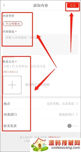 3、最后进入添加内容界面,选择内容类型、输入内容描述、联系方式、上传图片、诉求部门、是否匿名发表,点击【发表】即可